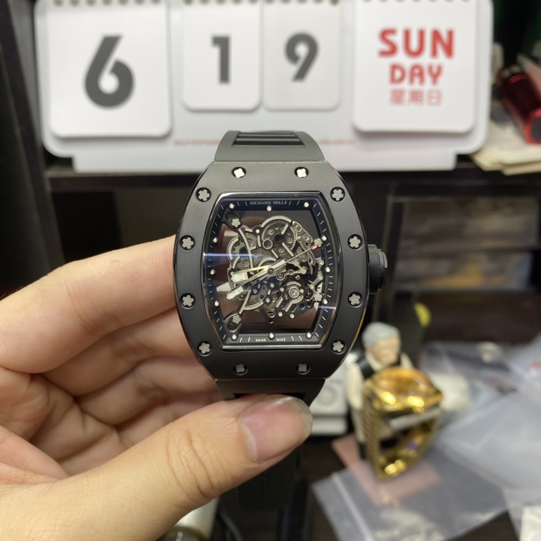 • Richard Mille Men's Collection series RM055, Black Ceramic Case with Skeletonized Movement Design, 49.90 x 42.70mm size.
