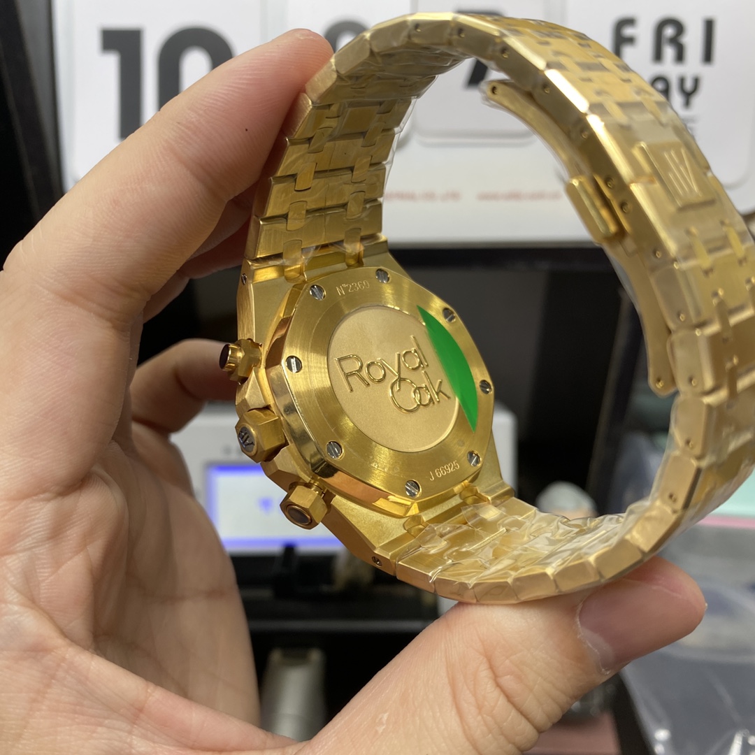 ·Dial Material: Green dial with "Grande Tapisserie" large grid pattern decoration, featuring yellow gold luminescent applied hour markers and Royal Oak hands.